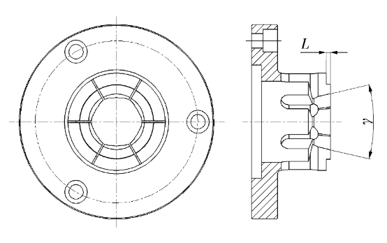 1)彈簧夾頭(圖 3)中夾具夾持面的寬度 L 要比保持架座底厚度(保持架座總高度 - 鉚頭高度- 兜孔深度)小 0. 2 mm 左右,如果 L 值等于或大于保持架座底厚度,銑刀銑削兜孔時與夾具干涉;L 值取太小,夾具的夾持面變小,銑削兜孔時保持架容易打滑。
